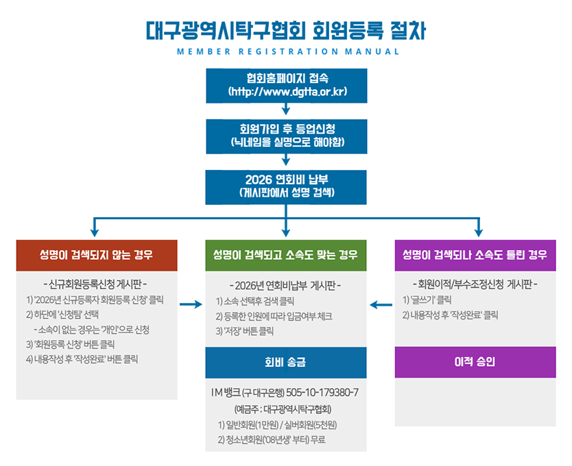 등록비 입금계좌 : IM뱅크( 대구은행) 505-10-179380-7 (예금주 : 대구광역시탁구협회)